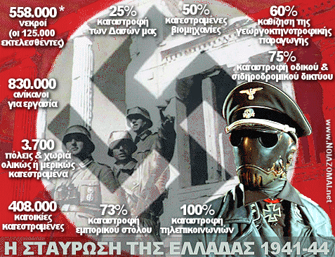 χο και υπό κατοχή ελληνικό πληθυσμό, με την καταλήστευση του Εθνικού Πλούτου μας και την υποχρέωση της Ελλάδας να πληρώνει εκείνη τα δυσβάσταχτα έξοδα του Στρατού Κατοχής, οδηγώντας σε θάνατο από πείνα εκατοντάδες χιλιάδες Έλληνες!