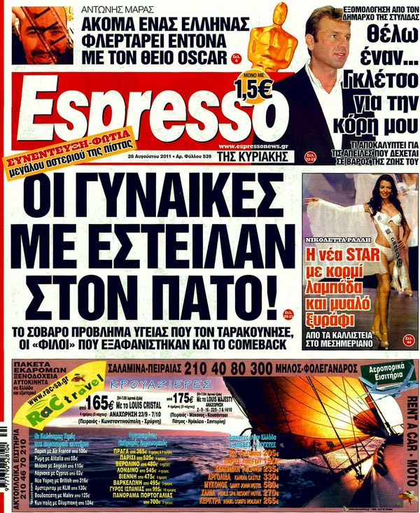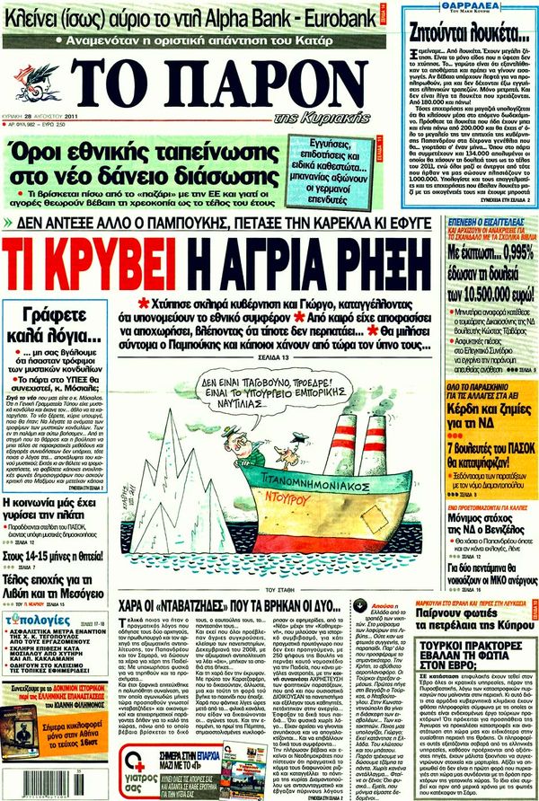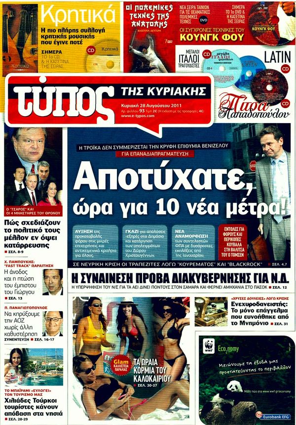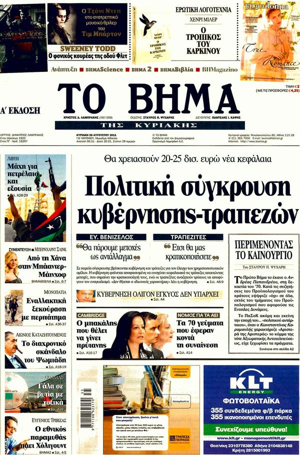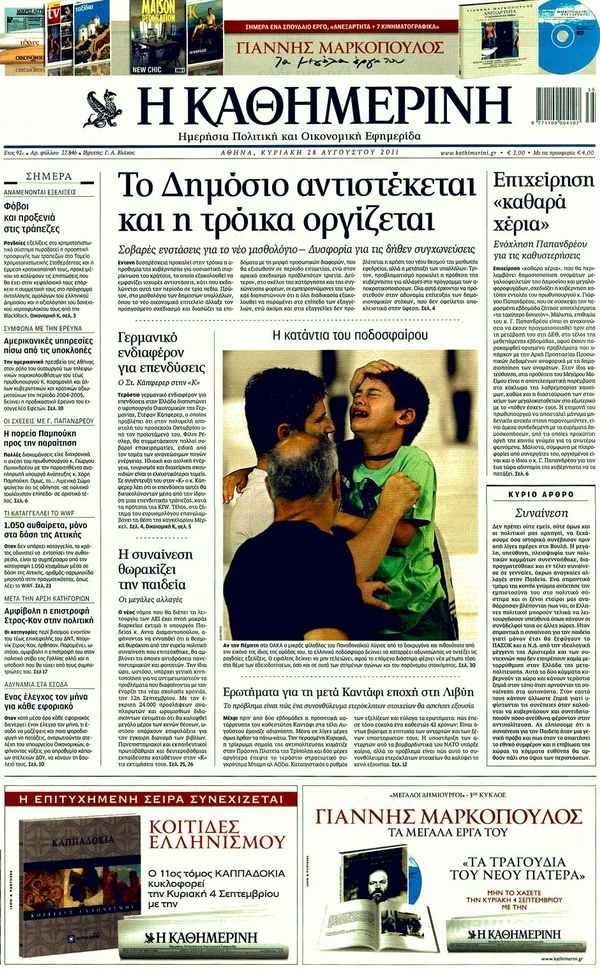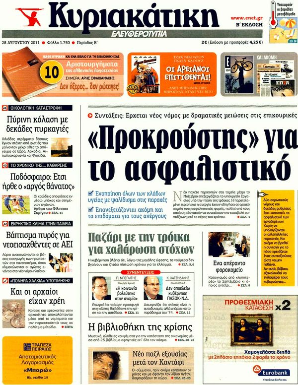 Ο νέος νόμος με τις δραματικές μειώσεις στις επικουρικές συντάξεις, η πολιτική σύγκρουση Κυβέρνησης και τραπεζών καθώς και η δυσαρέσκεια των στελεχών της τρόικας που θα επισκεφτούν τη χώρα μας την επόμενη εβδομάδα, είναι μερικά από τα θέματα που συγκεντρώνουν το ενδιαφέρον των αυριανών Κυριακάτικων εφημερίδων.