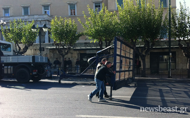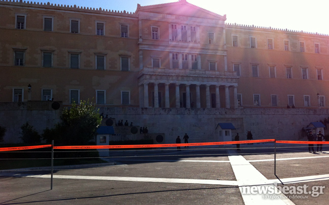 Όπως φαίνεται και από τις φωτογραφίες, ο φράχτης στα «λουλουδάδικα» έχει πάρει θέση μάχης ενώ υπάρχουν διασκορπισμένες δυνάμεις των ΜΑΤ δεξιά και αριστερά από το μνημείο του Άγνωστου Στρατιώτη.