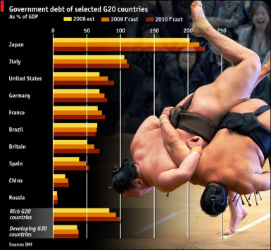 Οι αριθμοί μιλούν από μόνοι τους.Το ποσοστό του δημοσίου χρέους της Ιαπωνικής οικονομίας, της τρίτης μεγαλύτερης παγκοσμίως, είναι, κρατηθείτε, στο 233%, δηλαδή είναι το χειρότερο από κάθε άλλη αναπτυγμένη οικονομία, όπως αποδεικνύεται και στον πίνακα που βλέπετε πιο πάνω.