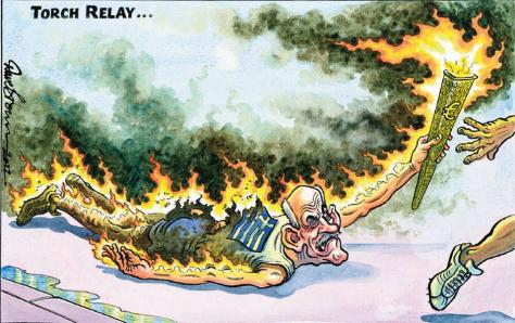 Ο βρετανικός Independent, δημοσιεύει μία σειρά από γελοιογραφίες που έχουν ως πρωταγωνιστές τους ηγέτες της ΕΕ και την οικονομική φωτιά που καλούνται να σβήσουν κι όπως όλα δείχνουν δεν μπορούν. Όπως είναι αναμενόμενο τη τιμητική του έχει ο Έλληνας πρωθυπουργός Γιώργος Παπανδρέου,που από πολλούς μπορεί και να χαρακτηρίζεται...εμπρηστής. Στη πρώτη γελοιογραφία τον βλέπετε με τη δάδα των πιο επιτυχημένων Ολυμπιακών Αγώνων του 2004,οι οποίοι μας κόστισαν πολλά και επιβάρυναν τα άθλια οικονομικά μας.