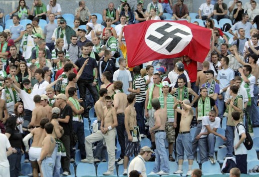 | Ουκρανοί φίλαθλοι σε αγώνα που έγινε στο Κίεβο την Τετάρτη κρατούσαν σημαία με την σβάστικα και χαιρετούσαν ναζιστικά. ΦΩΤΟ REUTERS |