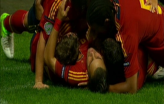 Οι Ισπανοί μπήκαν αποφασισμένοι να επιβάλουν το ρυθμό τους στο ματς και το κατάφεραν σε όλο το πρώτο ημίχρονο. Με εξαιρετική κυκλοφορία της μπάλας οι φούριας ρόχας έφταναν με ευκολία κοντά στην περιοχή του Διούδη, όμως ο Έλληνας πορτιέρο ήταν σε εξαιρετική ημέρα.