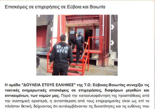 Το ονομάζουν ενημερωτικές επισκέψεις σε επιχειρήσεις. Ονομάζονται "Δουλειά στους Έλληνες", αλλά είναι ομάδα από την Χρυσή Αυγή. Και επι της ουσίας ζητούν από επιχειρηματίες στην Εύβοια και την Βοιωτία να απολύσουν τους αλλοδαπούς υπαλλήλους τους και να προσλάβουν Έλληνες.