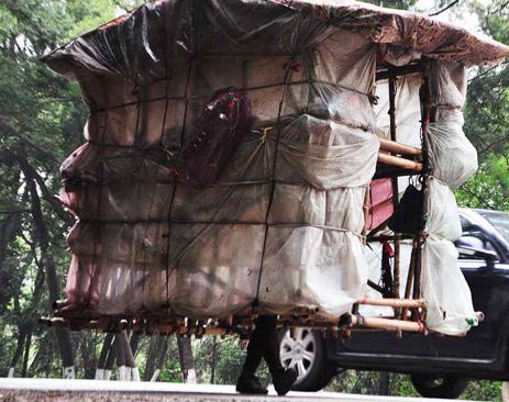 Φτιαγμένο από μπαμπού και πλαστικό, το φορητό σπίτι ζυγίζει περίπου 60 κιλά και προσφέρει καταφύγιο στο μακρύ ταξίδι του Liu μέσα στην Κίνα.