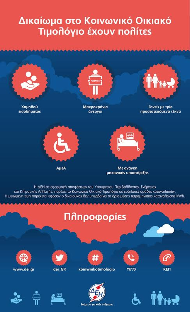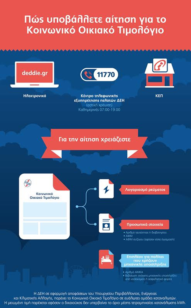 Η ΔΕΗ καλεί όλους τους ενδιαφερομένους να υποβάλουν αίτηση άμεσα προκειμένου να ενταχθούν στο ΚΟΤ, να επωφεληθούν από τις ελαφρύνσεις και να διασφαλίσουν την αδιάλειπτη ηλεκτροδότηση τους. Αιτήσεις γίνονται στα ΚΕΠ, ηλεκτρονικά στην ιστοσελίδα του ΔΕΔΔΗΕ www.deddie.gr, και τηλεφωνικά στο 11770 με αστική χρέωση τις καθημερινές 7 π.μ.–7 μ.μ.