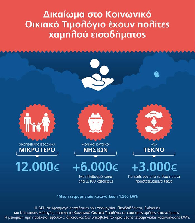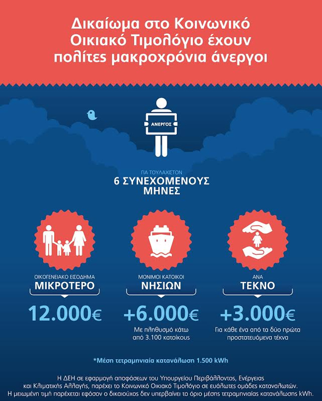 Οι μακροχρόνια άνεργοι για τουλάχιστον 6 συνεχόμενους μήνες και οι καταναλωτές με οικογενειακό εισόδημα μικρότερο από 12.000€, προσαυξανόμενο κατά 6.000€, εφόσον κατοικούν μόνιμα σε νησί με πληθυσμό κάτω από 3.100 κατοίκους. Το όριο των 12.000€ προσαυξάνεται κατά 3.000€ ανά τέκνο για τα δύο πρώτα προστατευόμενα τέκνα. Διευκρινίζεται ότι η μέση 4μηνιαία κατανάλωση θα πρέπει να κυμαίνεται από 200 kWh έως 1.500 kWh.
