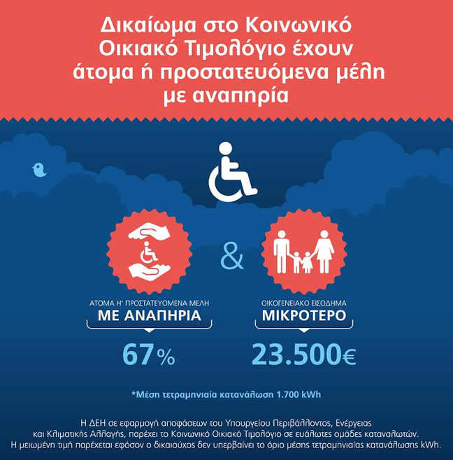 Τα άτομα με αναπηρία άνω του 67% ή με προστατευόμενα μέλη με αναπηρία άνω του 67% και οικογενειακό εισόδημα μικρότερο από το ποσό των 23.500€ και μέση 4μηνιαία κατανάλωση από 200 kWh έως 1.700 kWh.