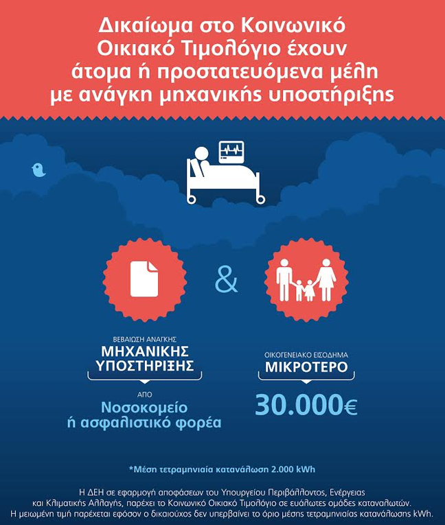 Τα άτομα που έχουν ανάγκη μηχανικής υποστήριξης ή έχουν προστατευόμενα μέλη των οποίων η ζωή εξαρτάται από τη χρήση ιατρικών συσκευών και οικογενειακό εισόδημα μικρότερο από το ποσό των 30.000€. Στην περίπτωση αυτή η μέση 4μηνιαία κατανάλωση θα πρέπει να κυμαίνεται από 200 kWh έως 2.000 kWh, ενώ πέραν του ορίου αυτού τιμολογείται με το ισχύον οικιακό τιμολόγιο που αντιστοιχεί στη συνολική 4μηνιαία κατανάλωση.