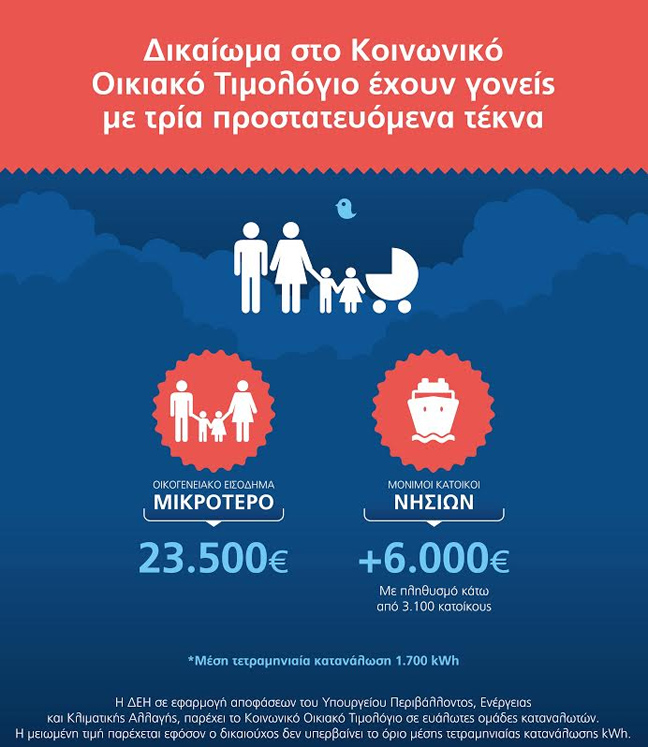 Οι γονείς με τρία προστατευόμενα τέκνα και οικογενειακό εισόδημα μικρότερο από το ποσό των 23.500€, προσαυξημένο κατά 6.000€, εφόσον κατοικούν μόνιμα σε νησί με πληθυσμό κάτω από 3.100 κατοίκους. Στην περίπτωση αυτή η μέση 4μηνιαία κατανάλωση θα πρέπει να κυμαίνεται από 200 kWh έως 1.700 kWh.