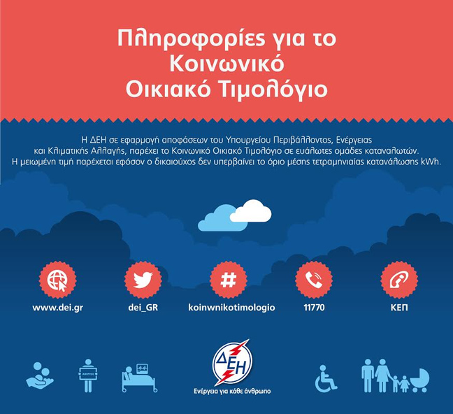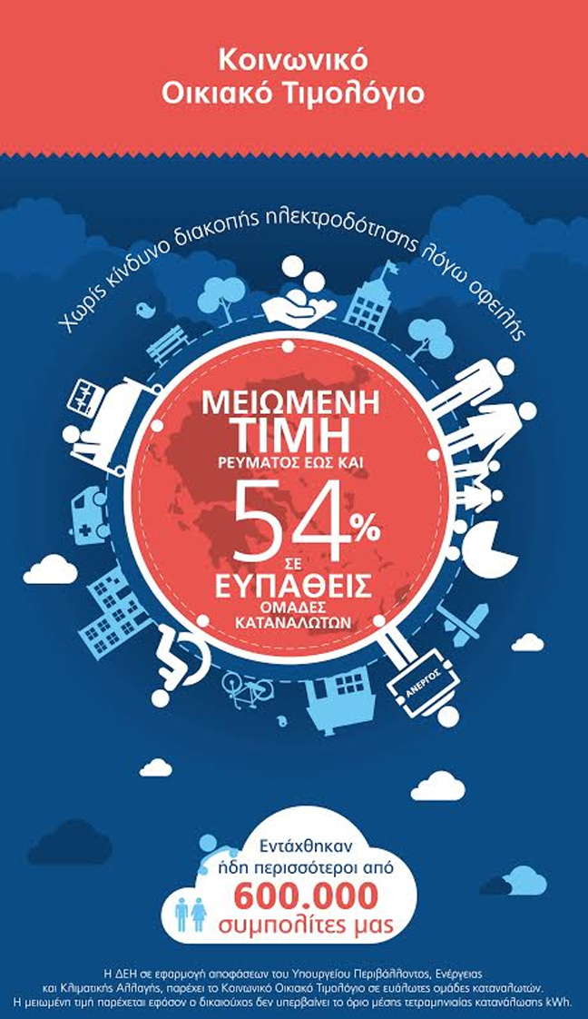 Η ΔΕΗ, εφαρμόζοντας την απόφαση του Υπουργείου Περιβάλλοντος, Ενέργειας και Κλιματικής Αλλαγής, παρέχει το Κοινωνικό Οικιακό Τιμολόγιο (ΚΟΤ) σε ευπαθείς ομάδες καταναλωτών με μειωμένη τιμή ρεύματος έως και 54% και αδιάκοπη ηλεκτροδότηση, στο οποίο έχουν ήδη ενταχθεί περισσότεροι από 600.000 πολίτες.