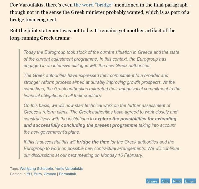 Για τον Βαρουφάκη, υπήρχε επίσης η λέξη «γέφυρα» που αναφερόταν στο τελευταίο εδάφιο -αν και όχι στο πνεύμα που ο Ελληνας υπουργός πιθανώς να ήθελε (για την ακρίβεια υπήρχε το ρήμα γεφυρώνω).