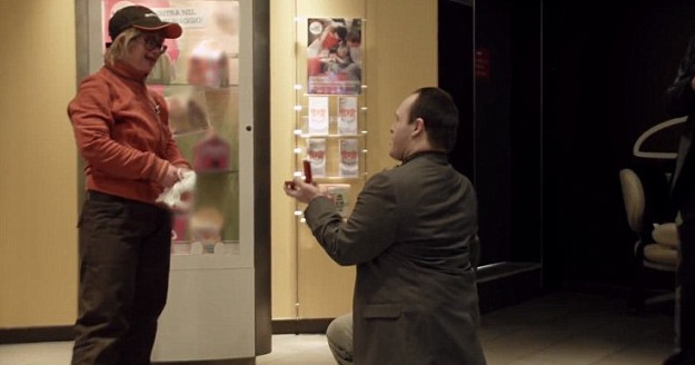 «Ονομάζομαι Salvatore και είμαι 38 χρονών. Θα κάνω έκπληξη στην Caterina, την κοπέλα μου», λέει ο πρωταγωνιστής του βίντεο λίγο πριν κάνει το μεγάλο βήμα και συνεχίζει. «Θα της ζητήσω να κάνουμε το όνειρό μας πραγματικότητα».