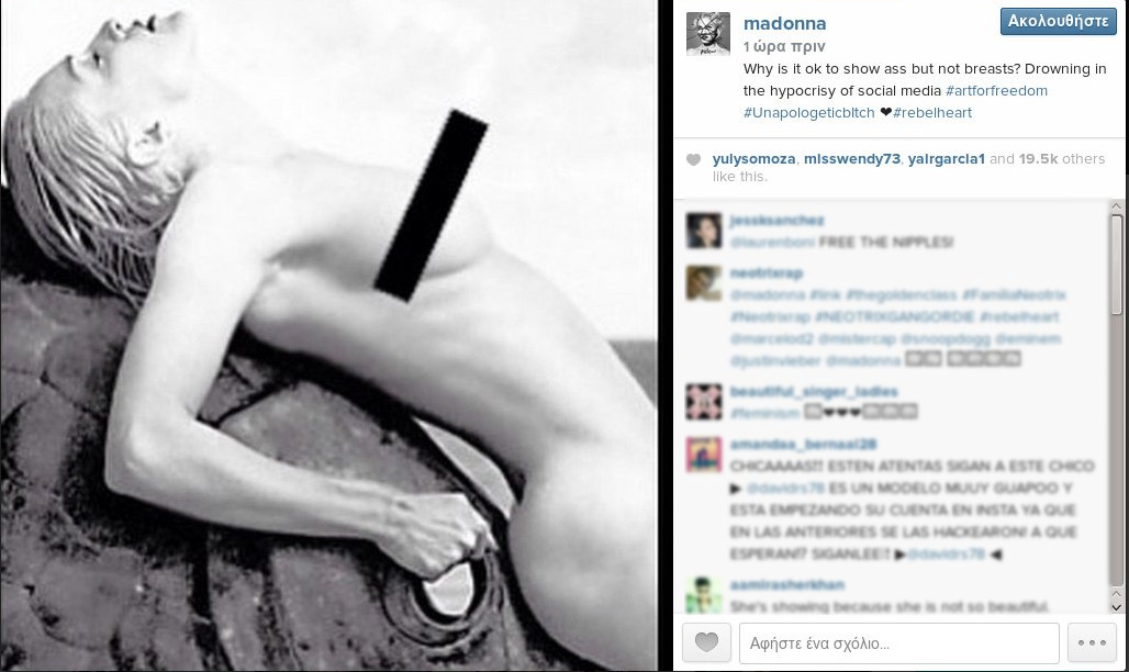 Το μέσο κοινωνικής δικτύωσης κατέβασε τη φωτογραφία, καθώς τη θεώρησε ανάρμοστη και η Μαντόνα εμφανώς εκνευρισμένη προχώρησε σε μια ακόμη πιο προκλητική ανάρτηση με μία εικόνα στην οποία δεν κρύβει τίποτα, γράφοντας: «Γιατί είναι εντάξει να δείχνεις κ@λ@ και όχι στήθος; Πνίγομαι στην υποκρισία των social media».