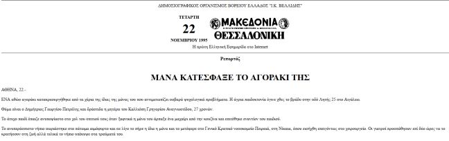 «Μάνα κατέσφαξε το αγοράκι της» ήταν ο τίτλος της εφημερίδας «Μακεδονία» στις 22 Νοεμβρίου 1995, μία ημέρα αφότου η 27χρονη Καλλιόπη Αναγνωστίδου είχε σκοτώσει το τρίχρονο παιδί της.