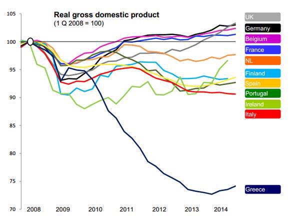 την ανάρτησή του και από το σχετικό γράφημα για την ανάπτυξη της χωρών της ευρωζώνης την τελευταία πενταετία. Μεταξύ αυτών και η Πορτογαλία και η Ιρλανδία, τα «θαύματα των προγραμμάτων λιτότητας» , όπως πολλοί υποστηρίζουν. Μια σύγκριση αρκεί....