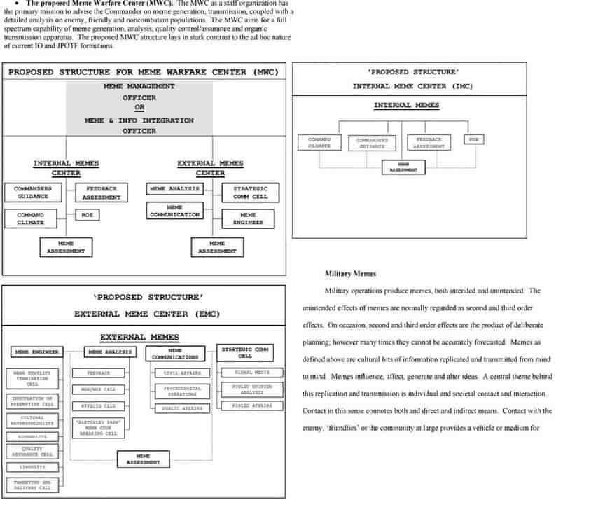 Για τον σκοπό αυτόν έχει δημιουργηθεί το «Meme Warfare Center», το οποίο είναι επιφορτισμένο με την παροχή συμβουλών στον εκάστοτε Αμερικανό Πρόεδρο για την παραγωγή, μετάδοση και λεπτομερή ανάλυση σχετικά με τον εχθρό, σε άμαχους πληθυσμούς.